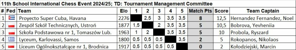The 11th edition of School friendly event was played on the ICCF server from 20.10.2024 to 31.05.2024 at 4 boards (teacher+3 students under 19). Five schools from 3 countries – Cuba, Greece and Poland – participated in the tournament. See more in previous post.