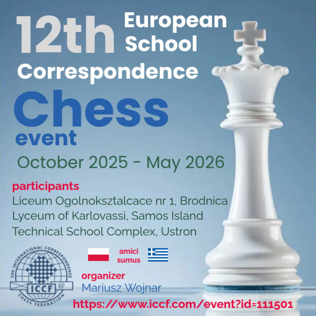 This is the 12th School International Chess Event 2025/26 played on the ICCF server from 20.10.2025 to 31.05.2026 at 4 boards (teacher+3 students under 19).