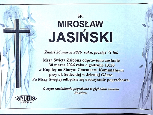 Z głębokim żalem zawiadamiamy, że 26 marca 2026 odszedł nasz kolega Miroslaw Jasiński.